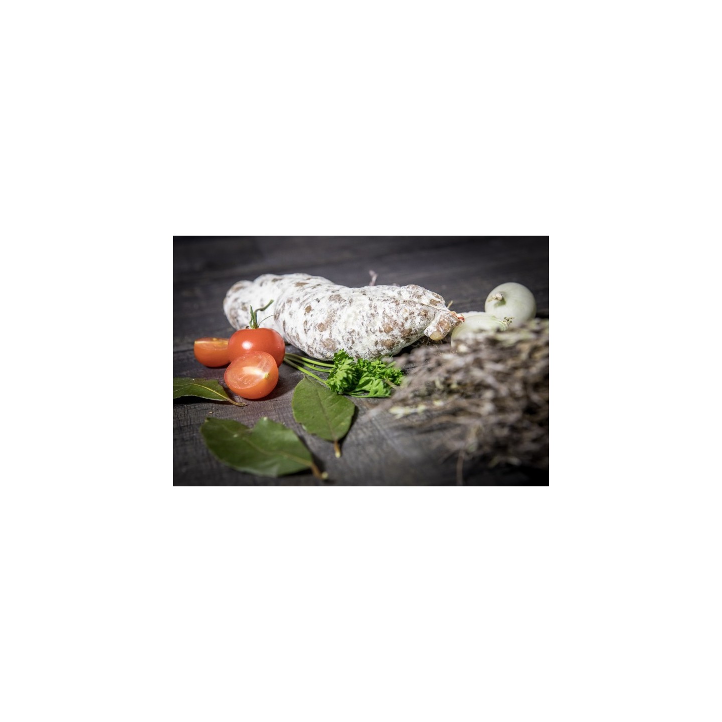 Saucisson pur porc a base de 80% de maigre minimum. Ce saucisson est proposé sec à très sec. Il est composé de viande de porc, sel, épices et aromates, ferments. Nous fabriquons nos saucissons dans des boyaux de porcs naturels. Tous nos saucissons sont recouverts d'une belle fleur blanche noble.