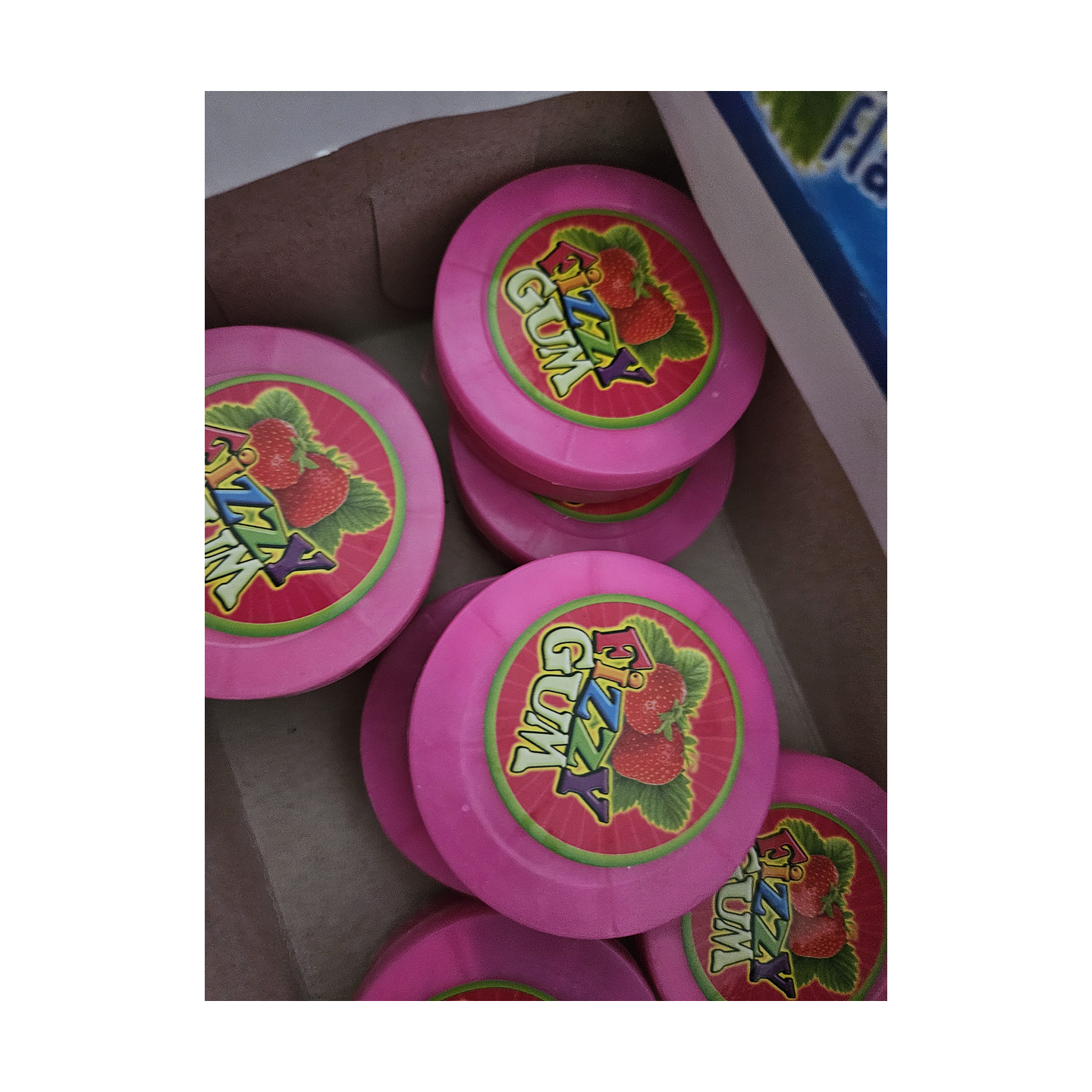 petite boite ronde contenant 3 ou 4 billes de chewing-gum et de la poudre légèrement acidulée, goût fraise. Contient également un mini cuillère pour goûter la poudre. Ne convient pas aux enfants de moins de 3 ans.