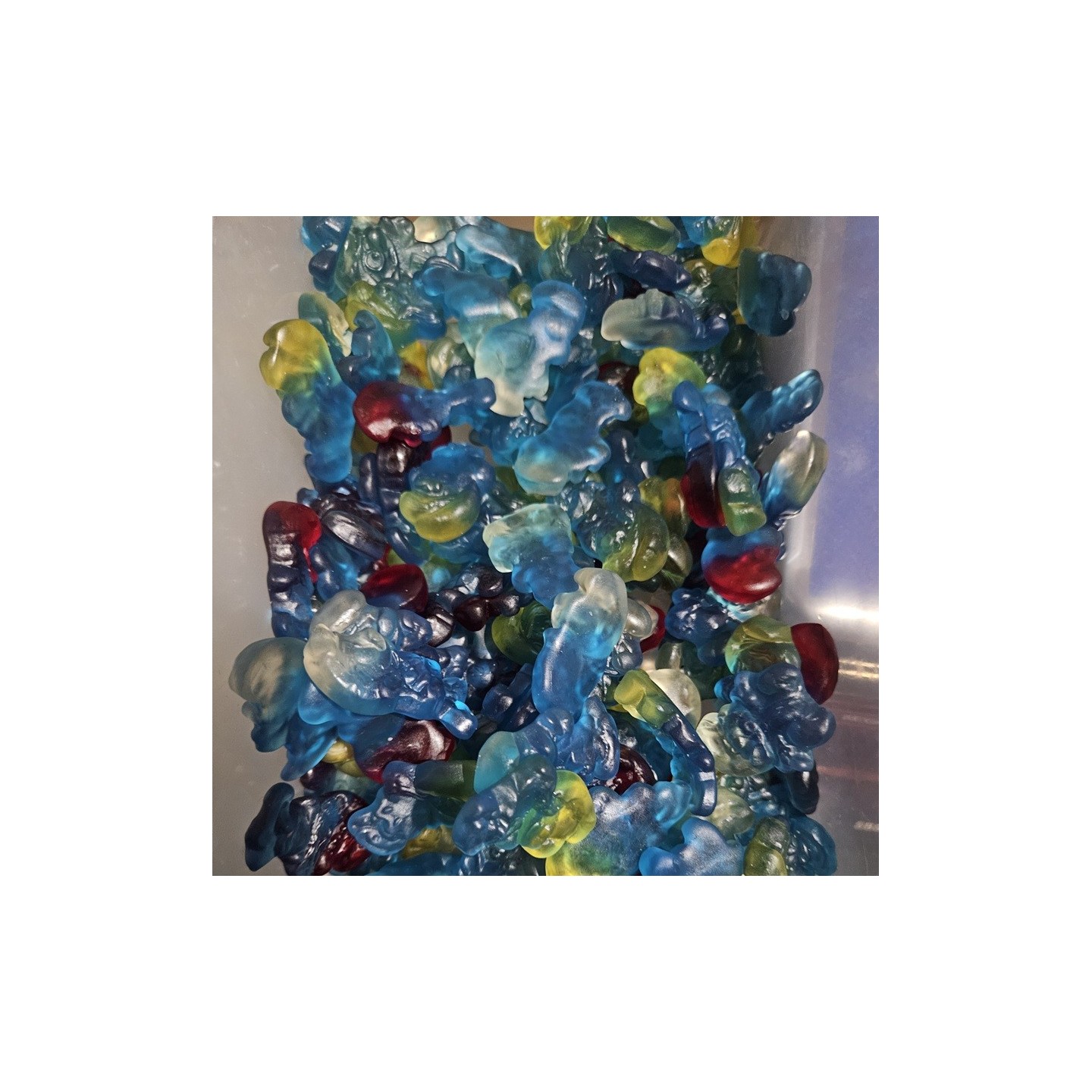 - Ingrédients : (sous réserve de modification par le fabriquant) Sirop de glucose, sucre, gélatine, dextrose, acidifiant : acide citrique, arômes, colorants : carmins, bleu patenté, lutéine, agents d'enrobage : cire d'abeille, cire de carnauba.