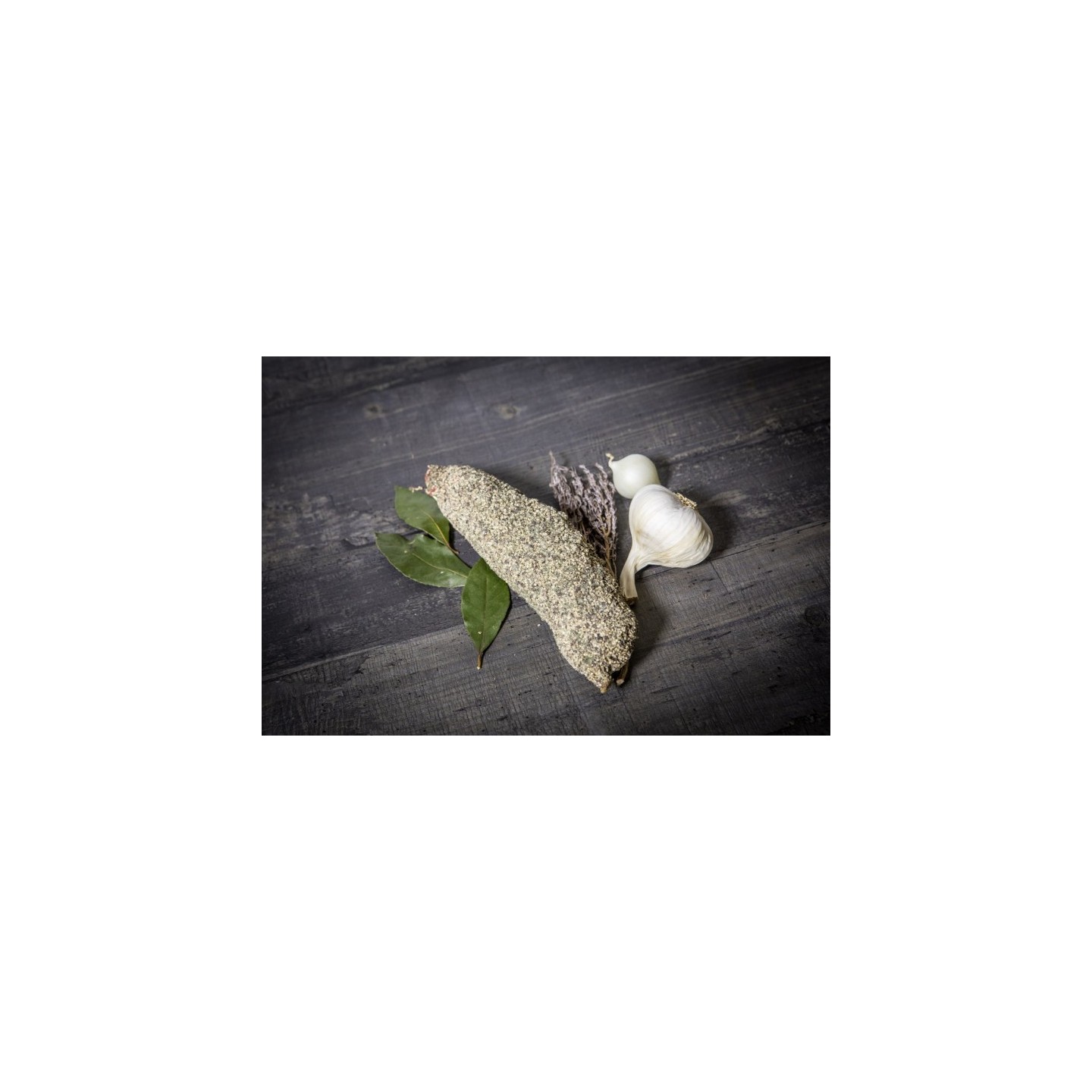 Saucisson pur porc au poivre à base de 80% de maigre minimum. Ce saucisson est proposé sec à très sec. Il est composé de viande de porc, sel, épices et aromates, ferments. Nous fabriquons nos saucissons dans des boyaux de porcs naturel.